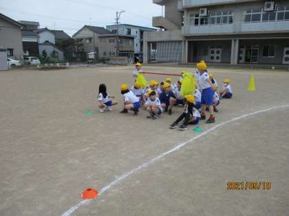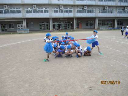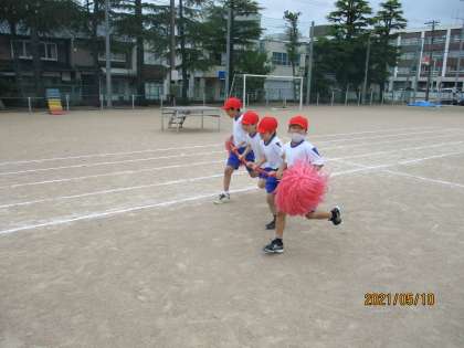 「西っ子タイフーン」は毎年中学年の子どもたちが取り組む団体競技で、一本の棒を4人一組で持ち、その名の通りタイフーンのようにコーンを周りながら駆け抜け、棒をつないでいくものです。4人の息を合わせること、団全体が一体のなって動くことが求められ、「心を一つに」することが大切になります。