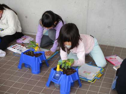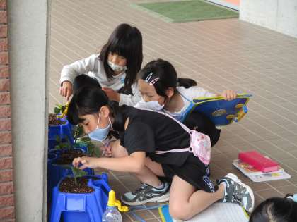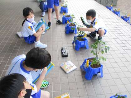 植えたばかりの野菜の苗を観察しました。国語科で学習したことを生かして、大きさや形、におい、長さ等に着目して、じっくりと観察していました。