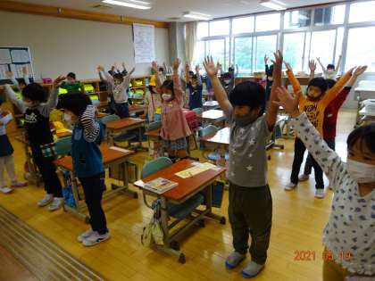 毎朝、練習しているラジオ体操がとても上手になりました。運動委員会のお兄さん、お姉さんから教わるワンポイントアドバイスのおかげですね。