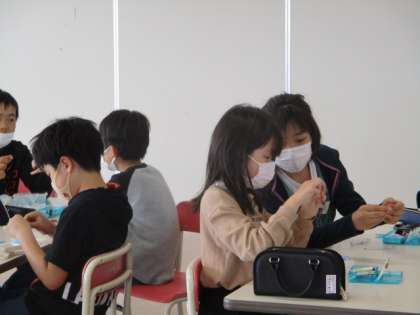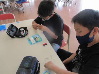 家庭科では、裁縫の学習を学年でしています。「玉結び」「玉止め」を練習した後、波縫いにトライしています。クラスが入り交じって、いつもと違う雰囲気の中、楽しみながら学習を進めています。