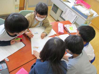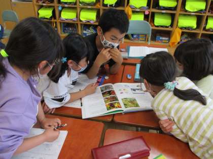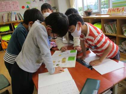 1年生の時に「生き物を育てよう」で、虫の学習をしました。2年生では、『ザリガニ』を育てようと計画しています。中には飼育経験のある子もいますが、初めての子がほとんどで、グループに分かれて飼育方法について本で調べました。