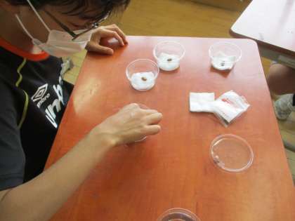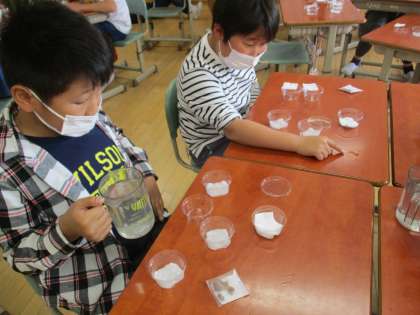 理科の学習で、発芽の条件について学習しています。発芽に必要なものは何かを予想し、観察実験をしています。発芽するのはどれか、気になる5年生です。