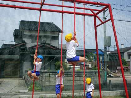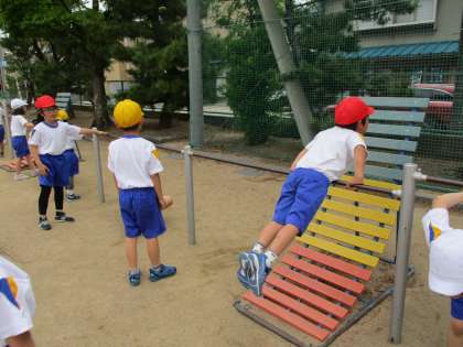 今、鉄棒とのぼり棒の学習をしています。昨年のうんていに比べ、難易度が上がりましたが、子どもたちは弱音を吐かず、少しでも上ろうとがんばっています。鉄棒にも一生懸命に取り組んでいます。