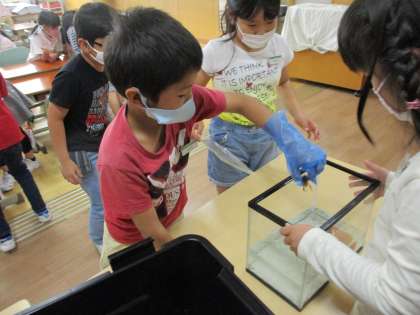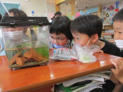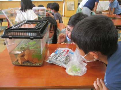 生き物を育てよう」の学習で、ザリガニを育てます。ザリガニについて調べ始めた時は「気持ち悪い。」と言っていた子どもたちですが、出会いの日が近づくにつれ、「どんな隠れ家をつくろうかな。」「気に入ってくれるといいな。」など育てることを楽しみにしている様子が見られました。