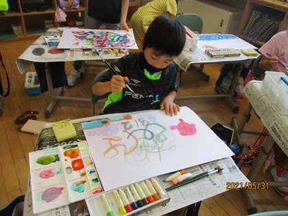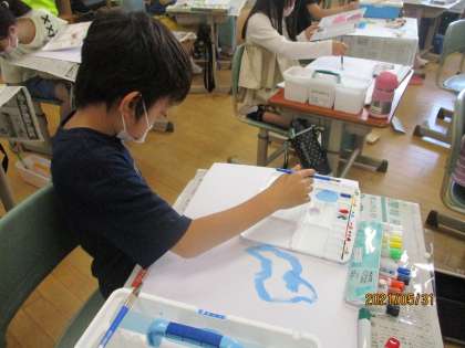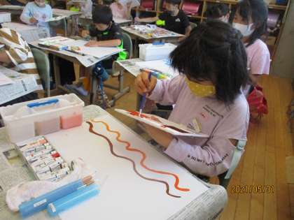 図画工作では「絵のぐ+水+ふで=いいかんじ!」に取り組みました。自分の好きな色を作り、水で濃さを調節しながら、筆で様々な線や形を描いていきました。子どもたちは自分の作り出す色や形におもしろさを感じながら思い思いに表現することができました。