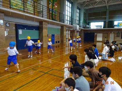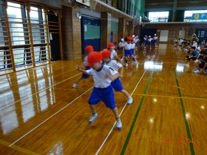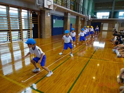 リズムよく、1・2・3、1・2・3と反復横跳びをしました。6年生のお兄さんお姉さんに数えてもらい、時間いっぱい跳びました。子どもたちは、お兄さんお姉さんに「がんばったね」と優しく声をかけてもらい、とても嬉しそうでした。