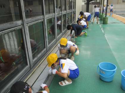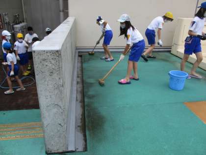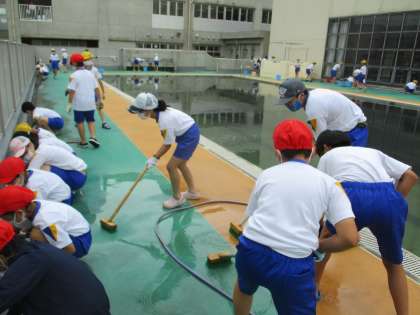 プール清掃をしました。5年生は、プールサイドを中心に、溝の掃除や床磨きをしました。「すごく黒くなっていたところがきれいになってきたね」「溝の泥がなくなって、水が流れたよ」と、清掃活動に全力で取り組みました。