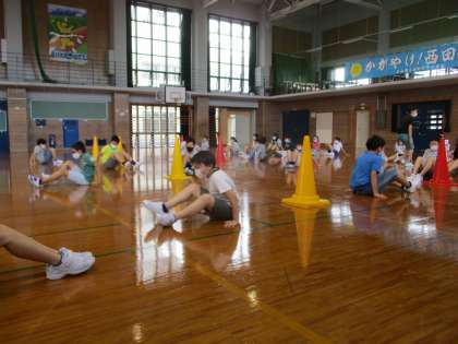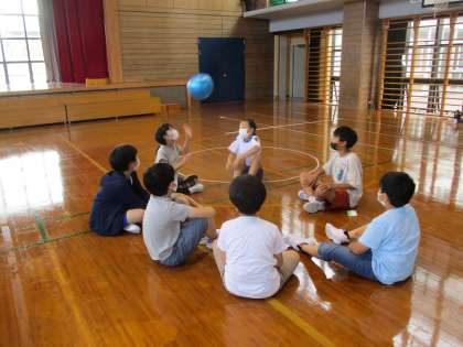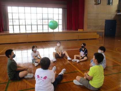 総合的な学習の時間に、パラリンピックの競技「シッティングバレー」に挑戦しました。まずは、床に座った状態で移動の練習。「なかなか進まないな」「おしりが痛いよ」といいながら移動していました。次は、座ったままでのバレーボール競技です。「ボールをとるのが大変」「これをできる選手はすごい」という声が聞かれました。