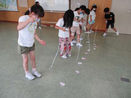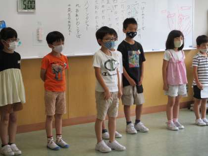 「ザリガニを育てよう」の学習のまとめとして、1組では各係に分かれてザリガニのお世話をした思い出に関する催し、2組では本や新聞でのまとめをすることになりました。1組では、手作りの本の読み聞かせやペープサート劇、ザリガニ釣りレース等がありました。どのクラスも子どもたちなりにザリガニとの思い出を楽しもうという気持ちを表していました。