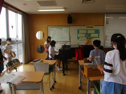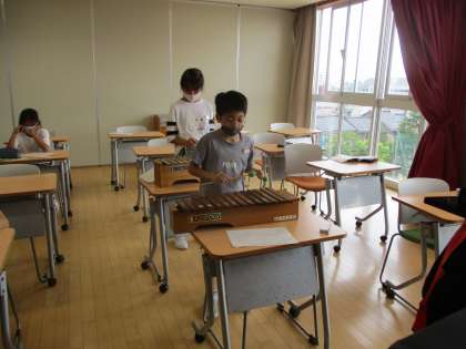 音楽の時間に,練習してきた合奏のグループ発表をしました。リコーダーや低音楽器、打楽器、鉄琴、木琴のパートに分かれ、重なる音を楽しみました。「ソロの部分があってよかった」「音の重なりがきれいに聞こえたよ」と感想を言い合いました。