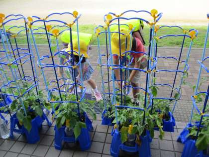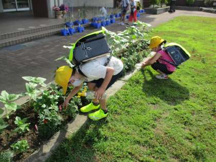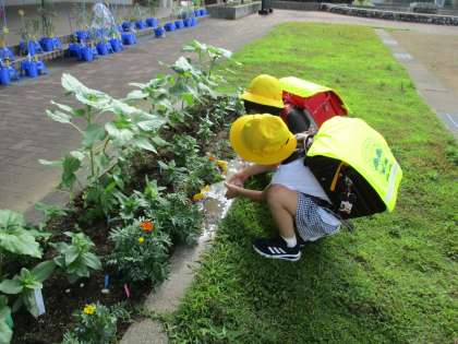 「先生、花が咲いたよ。」自分のアサガオの鉢だけでなく、花壇に植えた草花にも毎朝水やりをしています。小さな変化にも気付いて、知らせてくれる素敵な子どもたちです。