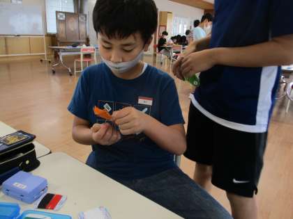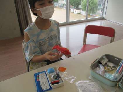 家庭科の時間に、針と糸を使い手縫いでマスコット作りに取り組んでいました。最後に綿をつめて、魚マスコットの完成です。名前をひらがな、カタカナ、漢字などで縫い取ったり、デザインをつけたりして仕上げました。