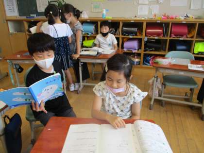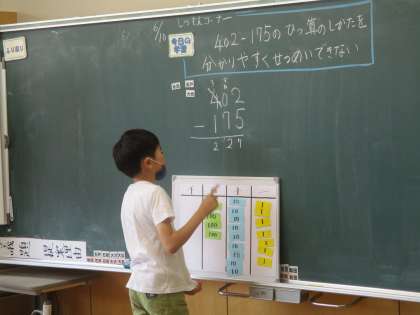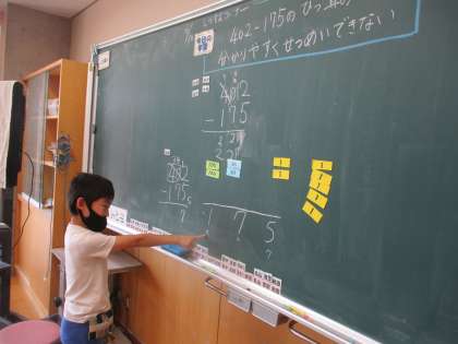 算数の学習の様子です。子どもたちは自分の学習のペースを考え、調整しながら自主学習を進めています。その中で、分からないところを質問したり、意見を出し合ったりしながら、みんなで学習内容の理解を深めています。