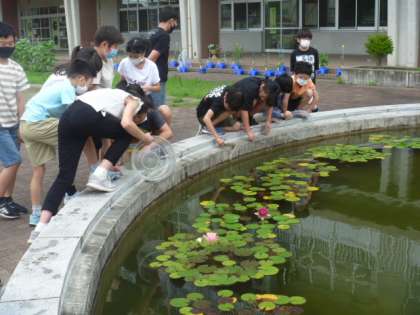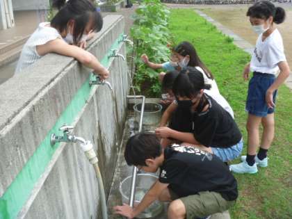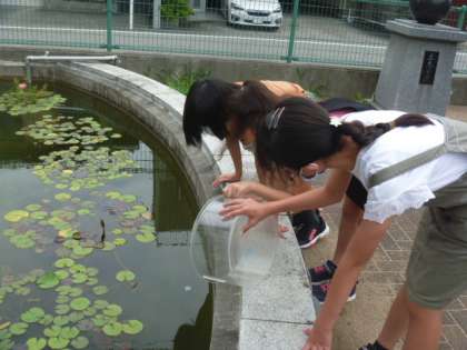 理科の学習で、メダカの観察をしていました。そのメダカたちを池に戻しました。教室近くに水槽を置いていたので、別れがさみしくなりましたが、学校の池に放流したので、またいつでも会えます。最後は、水槽をきれいにしました。
