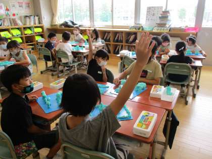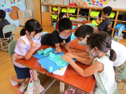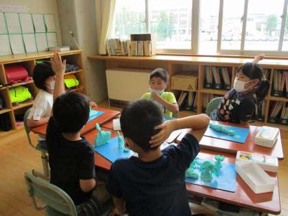 「夏といえば」を題材に、夏を感じるものを粘土で表しました。海や山等の自然、植物、カブトムシやセミ等の昆虫、かき氷や流しそうめん等の食べ物、キャンプをや日光浴をする人物等、子どもたちは思い思いの風物詩をつくりました。作品について友達に説明をしたり感想を伝え合ったりしながら、お互いの作品を楽しむこともできました。