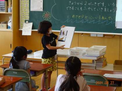 いよいよ2学期がスタートしました。少し身長が伸びた友達や、日焼けをして元気な友達と久しぶりに会うことができて、子どもたちはとても嬉しそうでした。始業式は、密を避けるために放送で行いました。校長先生からは、「何事にも全力で取り組み、自分らしくのびのびと過ごしていきましょう」とお話があり、子どもたちは、よい姿勢で真剣に聞いていました。学級活動では、クラスの友達と夏休みの思い出を語り合いました。