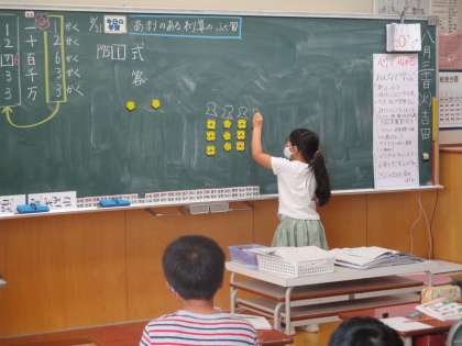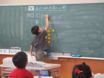 本格的に学習がスタートしました。算数では、1学期に終わりに学習した「あまりのあるわり算」を振り返ることから始めました。子どもたちがミニ先生となり、率先して解き方・考え方を説明しました。