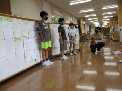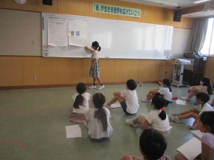 夏休みに地域のことについて調べてきたことを学年で伝え合う発表会を行っています。子どもたちがそれぞれの視点から地域の様子や特徴、よさを伝えていて、みんな真剣に聞いています。