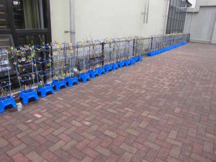 校舎外に置いてあるアサガオの鉢やプランターを壁際に移動しました。動いてしまいそうなマット等も玄関内に入れました。