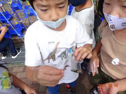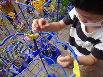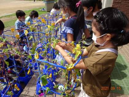 毎日欠かさずあさがおの水やりをしています。どんどん種ができ始めています。子どもたちは、大事そうに種取りをしました。「せんせい、こんなにたくさんの種ができています」と驚いていました。もちろんまだまだきれいな花を咲かせているあさがおもあります。あさがおの成長の変化を楽しみながらお世話を続けたいと思います。
