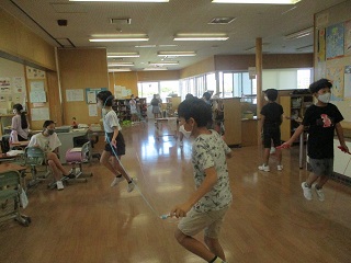 これまで朝のチャレンジタイムには、ラジオ体操を行っていました。2学期から火曜日と木曜日の2日間は、なわとびをすることになりました。2分間を跳び続けるためには、体力が必要です。食事や睡眠にも気を付けて、健康な体つくりに励みましょう。