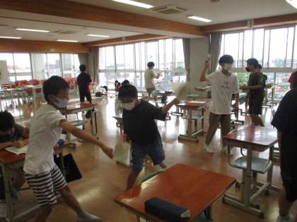 子どもたちが、いきいきタイムに運動委員会が作って持ってきてくれた紙鉄砲で楽しそうに遊んでいました。