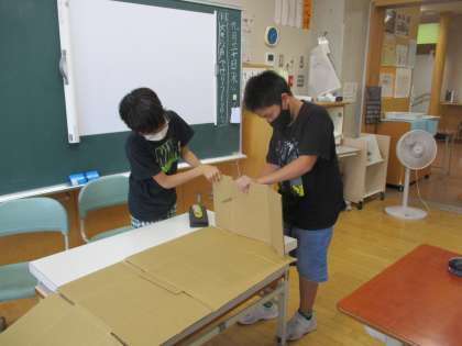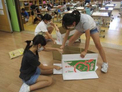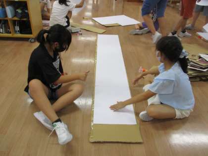 発表会の劇の小道具を作っています。物語を演出する背景や小物など、どんなものが必要かアイディアを出し合って取り組んでいます。
