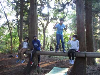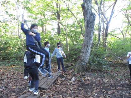 森の中で「ビーム(丸太よじのぼり)」「クモの巣」「ウォール(壁のぼり)」「ターザンロープ」をしました。