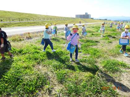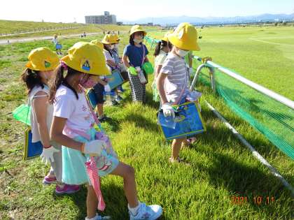 「草むらの中から、何か飛んだよ。バッタかな。」「大きいトンボがいたよ。」子どもたちは、楽しそうに生き物を見つけていました。