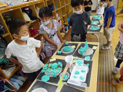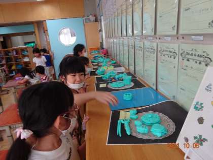 図画工作科「ごちそうパーティはじめよう」の学習では、ねん土をぎゅっとねじったり、ながく細くのばしてひも状にしてまいたりして、いろいろな形をつくって楽しみました。出来上がった作品をみんなで鑑賞しました。