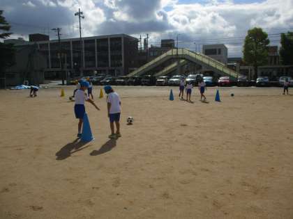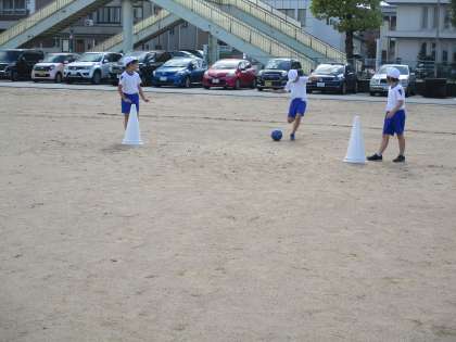 体育ではキックベースボールに取り組んでいます。狙ったところへ蹴る練習をしています。何度も蹴ってこつをつかもうとがんばっていました。