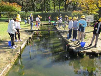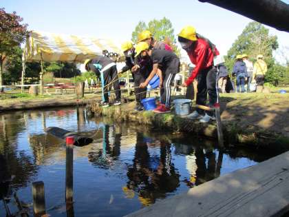 2日目の午後にはザリガニ釣りとバンブーチャレンジを行いました。ザリガニ釣りでは、友達にザリガニの場所を教えてあげたり、友達のザリガニが釣れると一緒に喜んだりする姿がみられました。バンブーチャレンジでは、班の仲間と集中して竹を高く積み上げたり、試行錯誤しながら竹に乗せた玉を転がしたりして楽しみました。