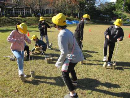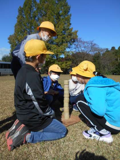2日目の午後にはザリガニ釣りとバンブーチャレンジを行いました。ザリガニ釣りでは、友達にザリガニの場所を教えてあげたり、友達のザリガニが釣れると一緒に喜んだりする姿がみられました。バンブーチャレンジでは、班の仲間と集中して竹を高く積み上げたり、試行錯誤しながら竹に乗せた玉を転がしたりして楽しみました。