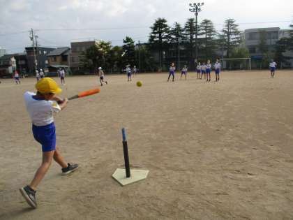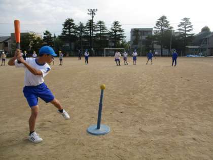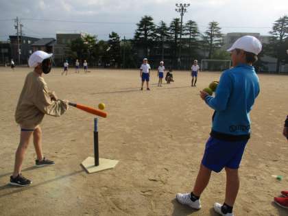 体育の学習で「ティーボール」をしています。今日は、棒の先に置いたボールを打つ練習をしました。ボールをしっかり見て遠くまで飛ばそうとがんばっています。慣れてきたら、ボールを拾う側にいる友達の名前を呼んでバッティングです。ちゃんと相手のところに届いたら互いに笑みがこぼれました。