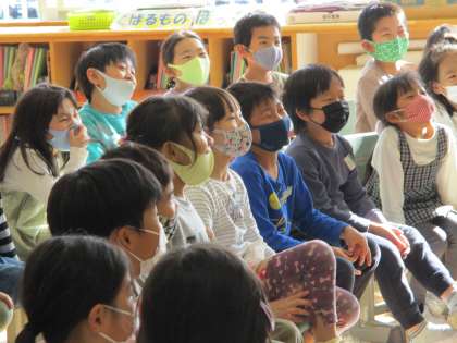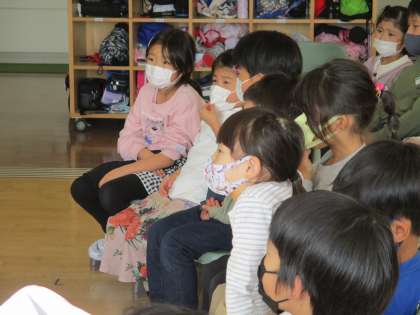 今日は久しぶりのおはなしゆうびんがあり、子どもたちは朝から楽しみにしていました。読書タイムに読み聞かせが始まると、読んでくださった本がとても面白く、子どもたちはどっぷりとお話の世界に入り込みました。驚いたり大笑いしたりしてとても楽しい時間を過ごしました。