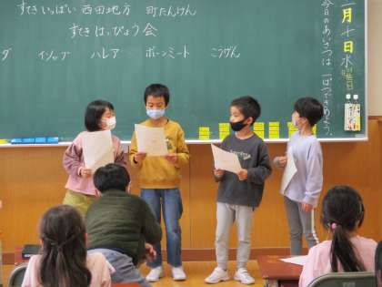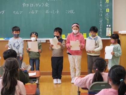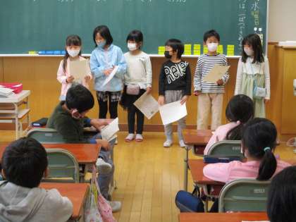 町たんけんで分かったステキなところを発表しました。それぞれに新聞にまとめ、学習参観には掲示したいと思います。