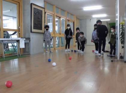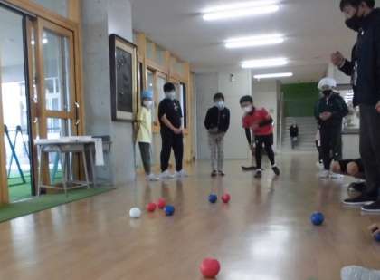 10月、西田地方小学校下社会福祉協議会よりボッチャとモルックを寄付していただきました。以来、休み時間に競技を楽しむ子どもたちが増えてます。ボッチャでは、白い球に近付けるように赤と青の球を投げて対決します。「やったー!」「あ〜っ!」と、子どもたちの楽しげな声が響いています。