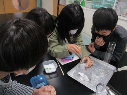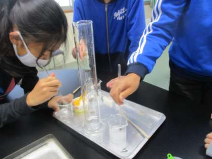理科の学習で「物の溶け方」を学習しています。実験2では、水の量を変えて、物が水に溶ける量を調べました。食塩とミョウバンを使って実験しました。「しっかりかき混ぜて溶かそう。」「ミョウバンはなかなか溶けないよ。」「白く溶け残ったね。」など、じっくり観察して考えていました。