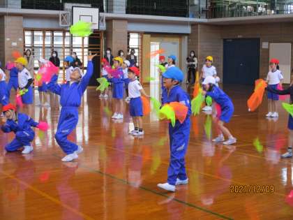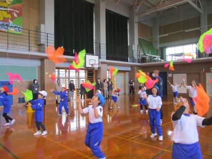 配布されたスカーフでは、「一体どんな運動ができるのだろう?」と不思議そうにしていた子どもたち。上へ投げてキャッチするという運動あそびは、楽しく体全体を使う運動でした。「できた!」「あ〜、ちがった。」など、声を上げながら、とても楽しく活動できた1時間でした。