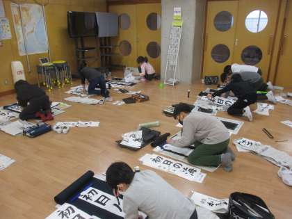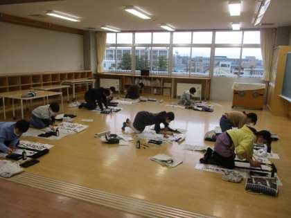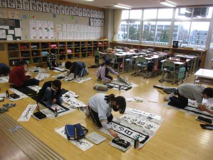 年明けの書き初め大会に向けて練習をしています。ポイントを確認しながら集中して書いています。