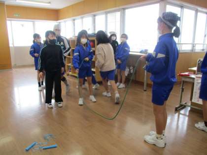 縄跳び大会に向けて、休み時間には短縄や大縄の練習に励んでいます。時間を計りながら回数を数えたり、友達にアドバイスしたりして記録を伸ばしています。