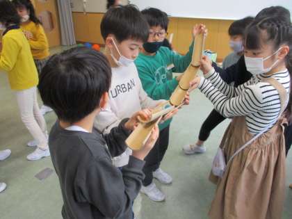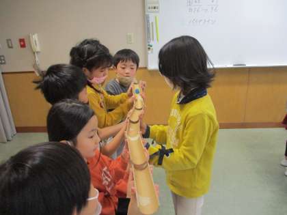クラスのチャレンジパワーや協力パワーを高めるために「パイプライン」というレクリェーションをしました。子どもたちはパイプの中を通るボールを落とさないように息を合わせてラインをつくって運んでいました。