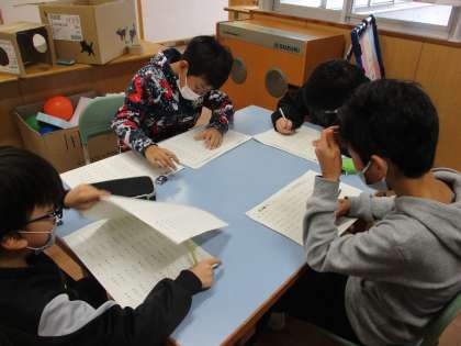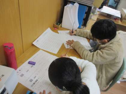 計算チャレンジテストに向けて、子どもたちはプリントコーナーから自分の苦手な範囲の問題を選び、学習に取り組んでいます。友だち同士で教え合いながら学習に臨んでいました。