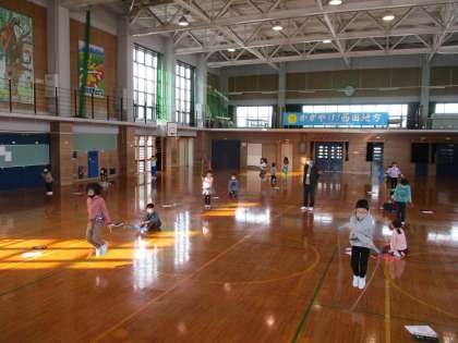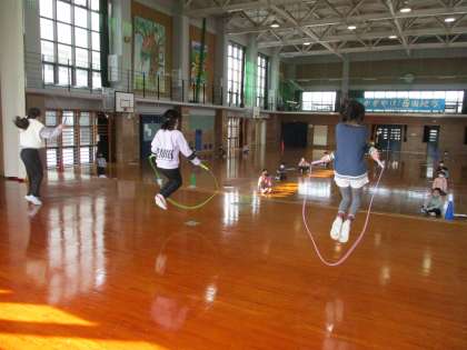 体育では、簡単な動きを取り入れたかけっこや短縄跳びなど、距離をとってできる運動に取り組んでいます。休み時間にも短縄の練習に励む子どもが多く、技や跳ぶ回数がどんどんレベルアップしています。