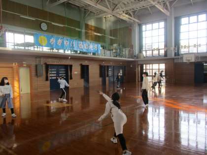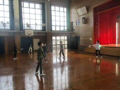 体育の時間に、バトミントンに挑戦しています。ラケットをもってシャトルを打ってみると、なかなか前に飛びません。それでも、ラリーを続けようとがんばっています。