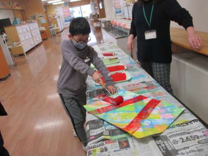 図画工作科の学習では、ステンシルローラー版画に取り組んでいます。ローラーでカラフルに色を付けた画用紙に、魚や星などの形に切ったシールを貼っていきました。黒い絵の具を塗ってシールをはがしたときに、どんな作品に仕上がるか楽しみです。