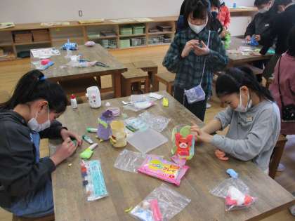 図画工作科の時間に、空き容器を使ってオリジナルのペン立てを作っています。