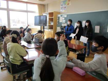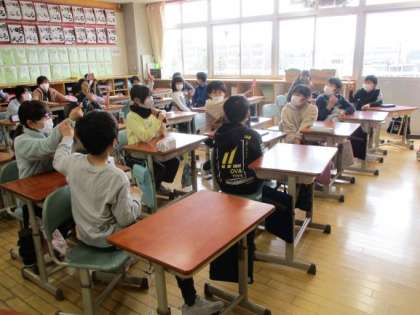 4年2組のゲーム係は、感染症対策をしながらみんなが楽しめるゲームを日々考えて企画しています。今日は、○×ゲームでした。係の人が手作りした○×札で気持ちを高めた子どもたちは大盛り上がり。冬期オリンピックに関するクイズを班の友達と楽しみました。