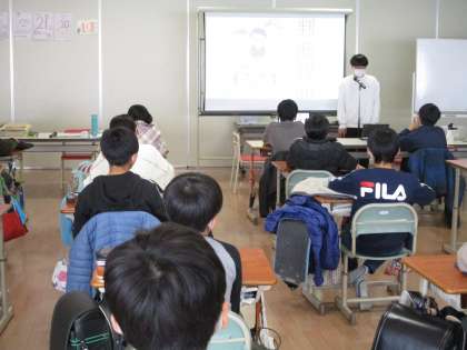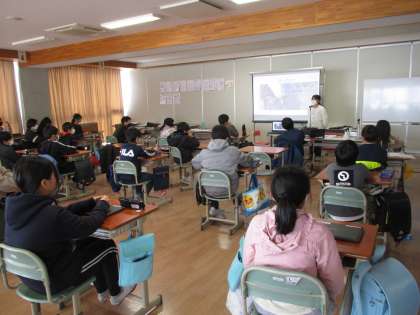 国語科「今、わたしは、ぼくは」の学習では、子どもたちがみんなに伝えたいことをスピーチしました。クロームブックのスライド機能を活用して堂々と発表する姿に成長を感じました。