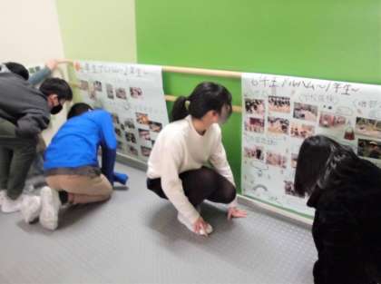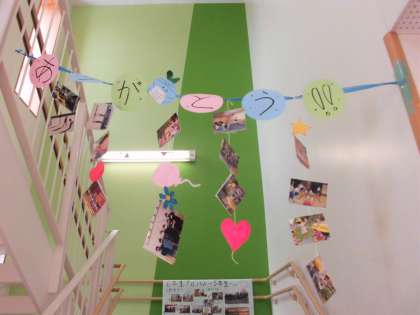階段には、5年生が制作した思い出アルバムが掲示してあります。6年生が西田地方小学校に入学してからの思い出写真を、1年ごとにまとめてあります。懐かしそうに眺める6年生でした。